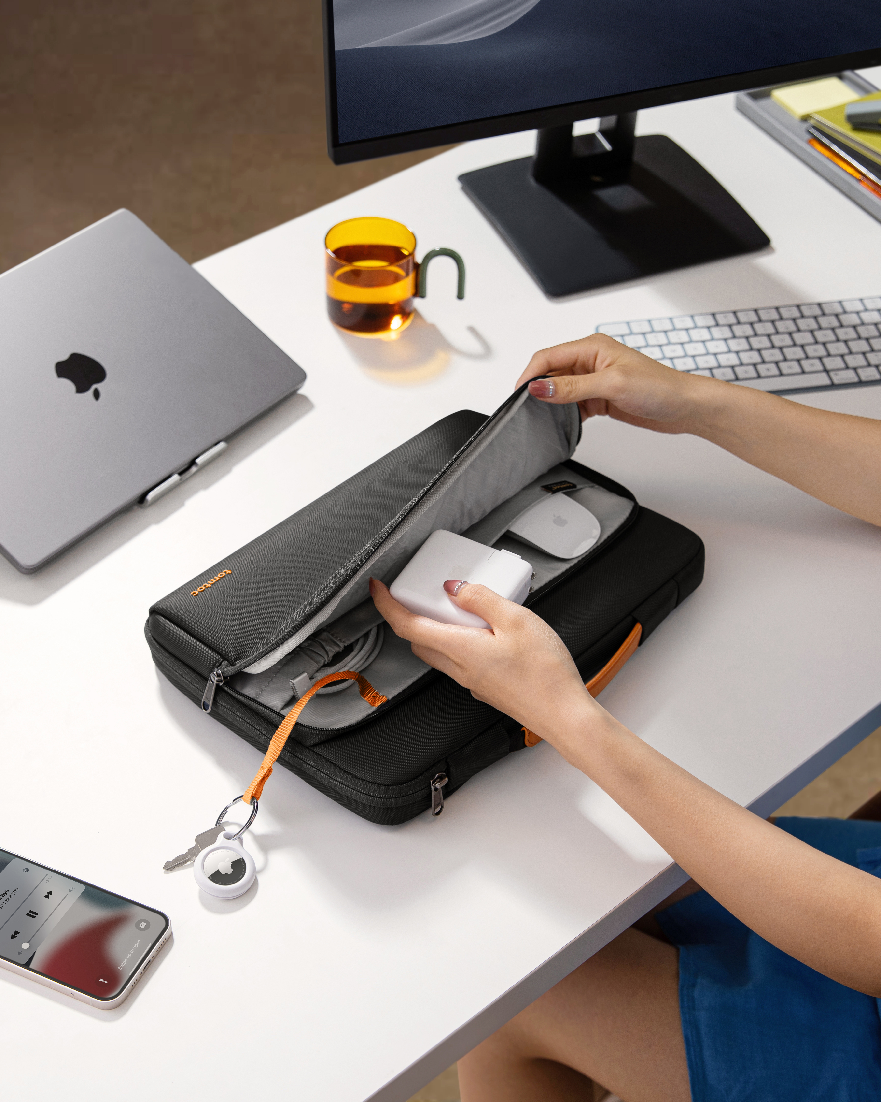 Convenient storage compartments keep your accessories neatly organized—store cables, chargers, and even an Air tag.