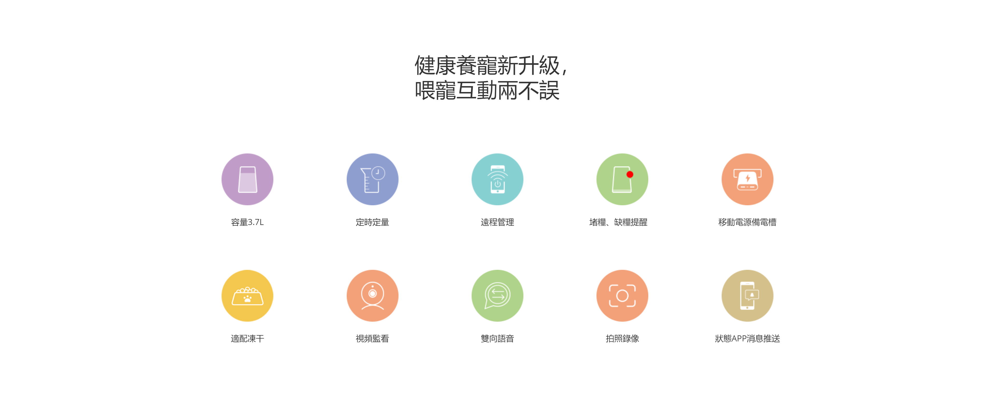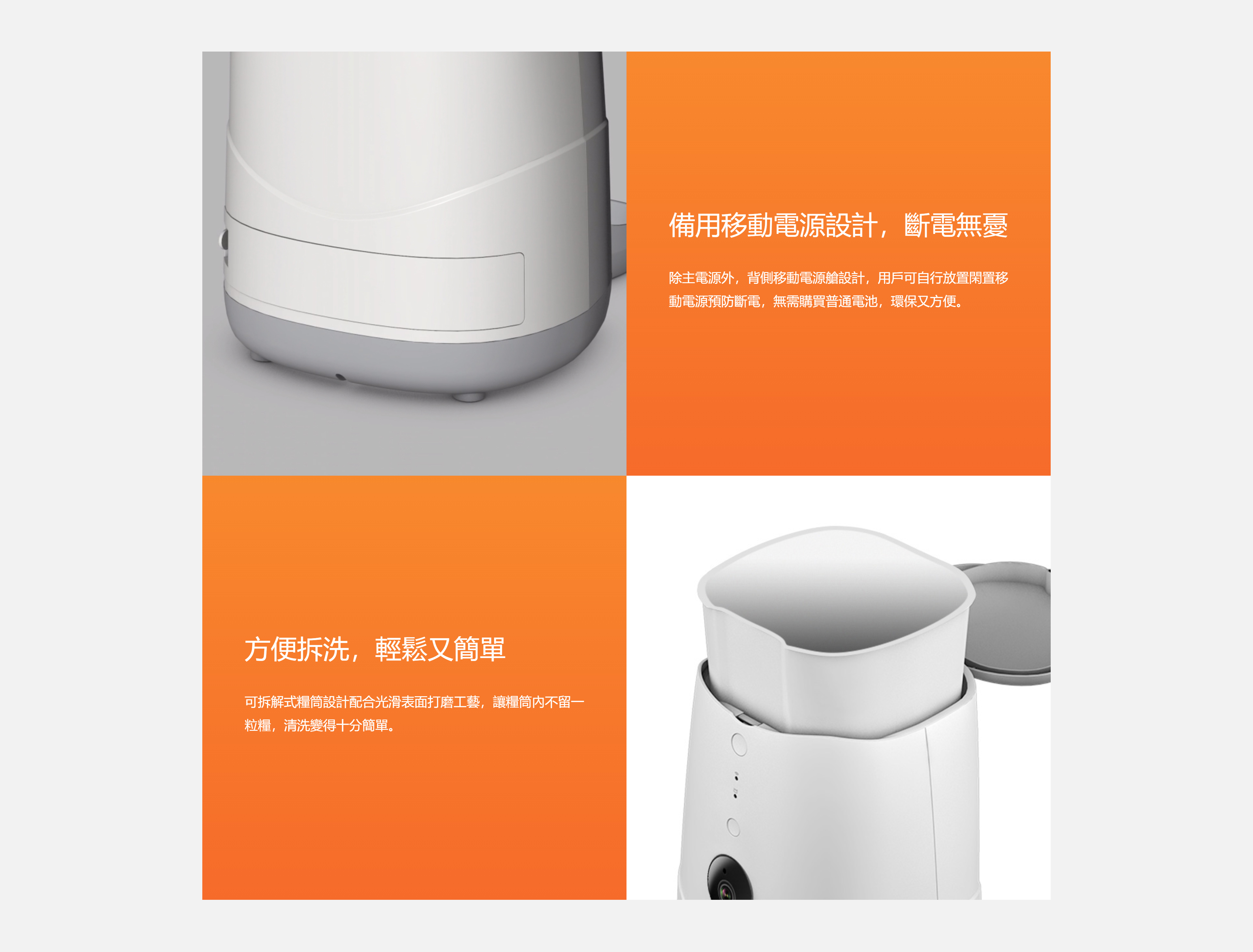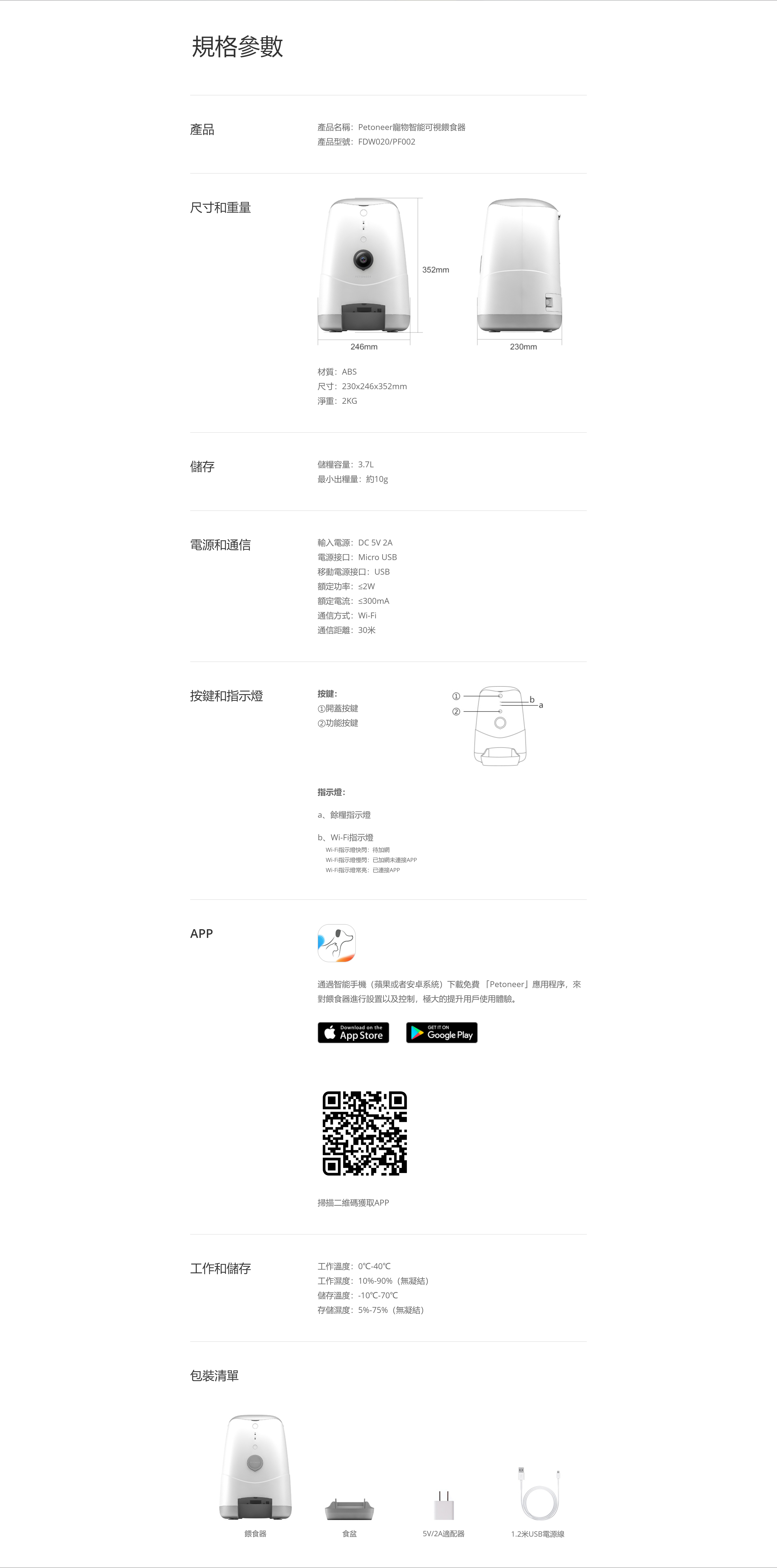 Capacity: 3.7L Input voltage: DC 5V 2A Communication: Wi-Fi Material: ABS High-definition night vision camera Two-way voice, interactive companionship, fun moments, share at any time Timed and quantitative, healthy feeding Food shortage reminder, instant smart detection Reversal mechanism, reverse rotation when stuck Separate design, free disassembly and washing Can be powered by a rechargeable bank, no power outages (*requires separate purchase of rechargeable bank)