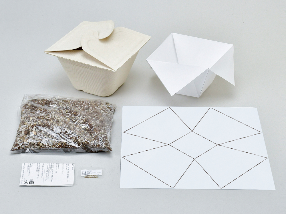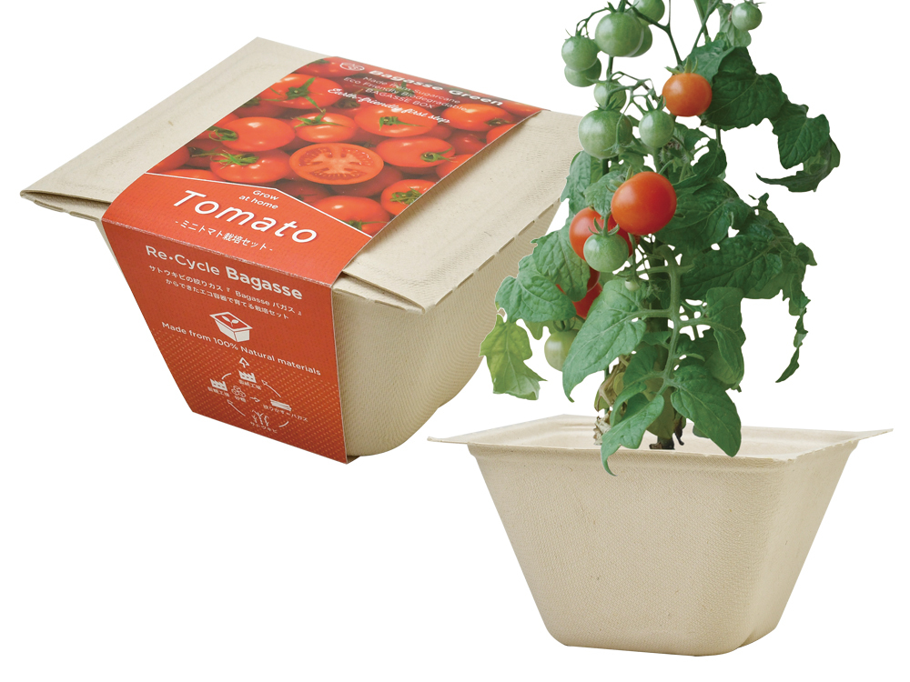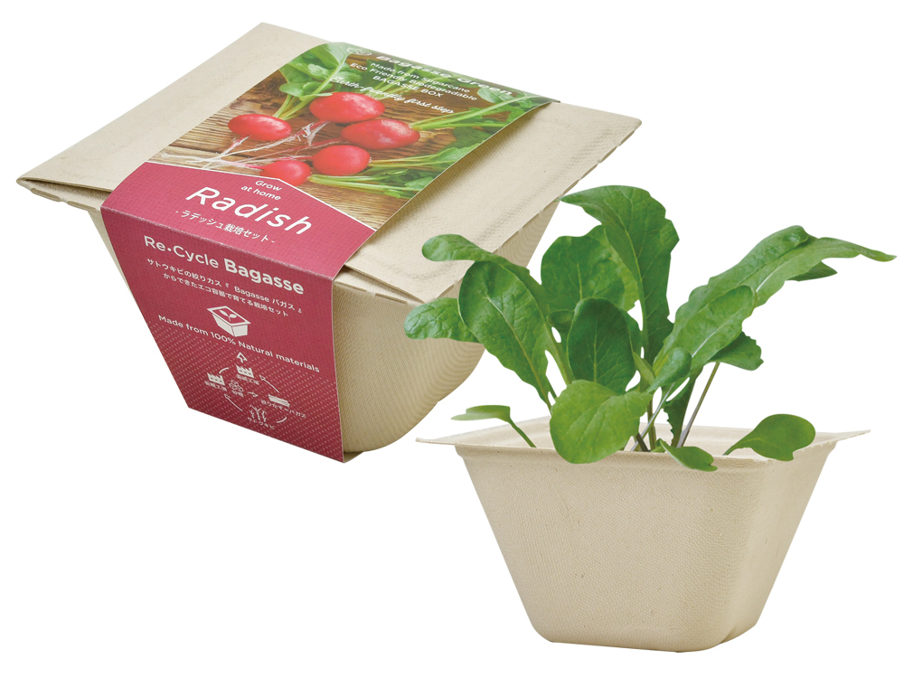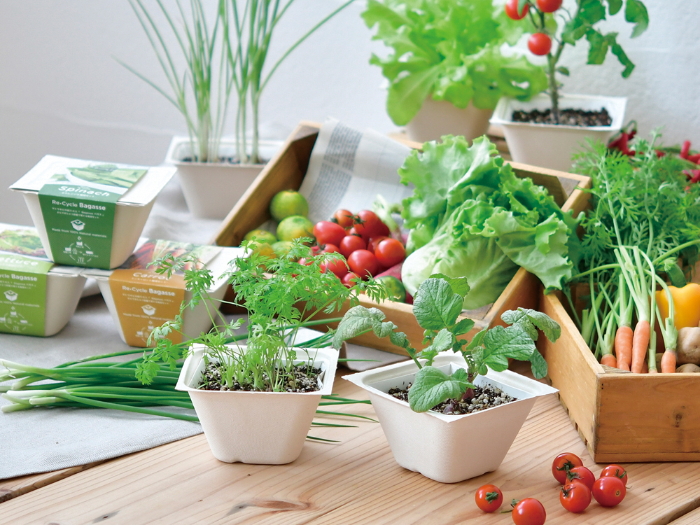 A cultivation set for growing vegetables in ecological containers made from bagasse (waste material from sugarcane production).