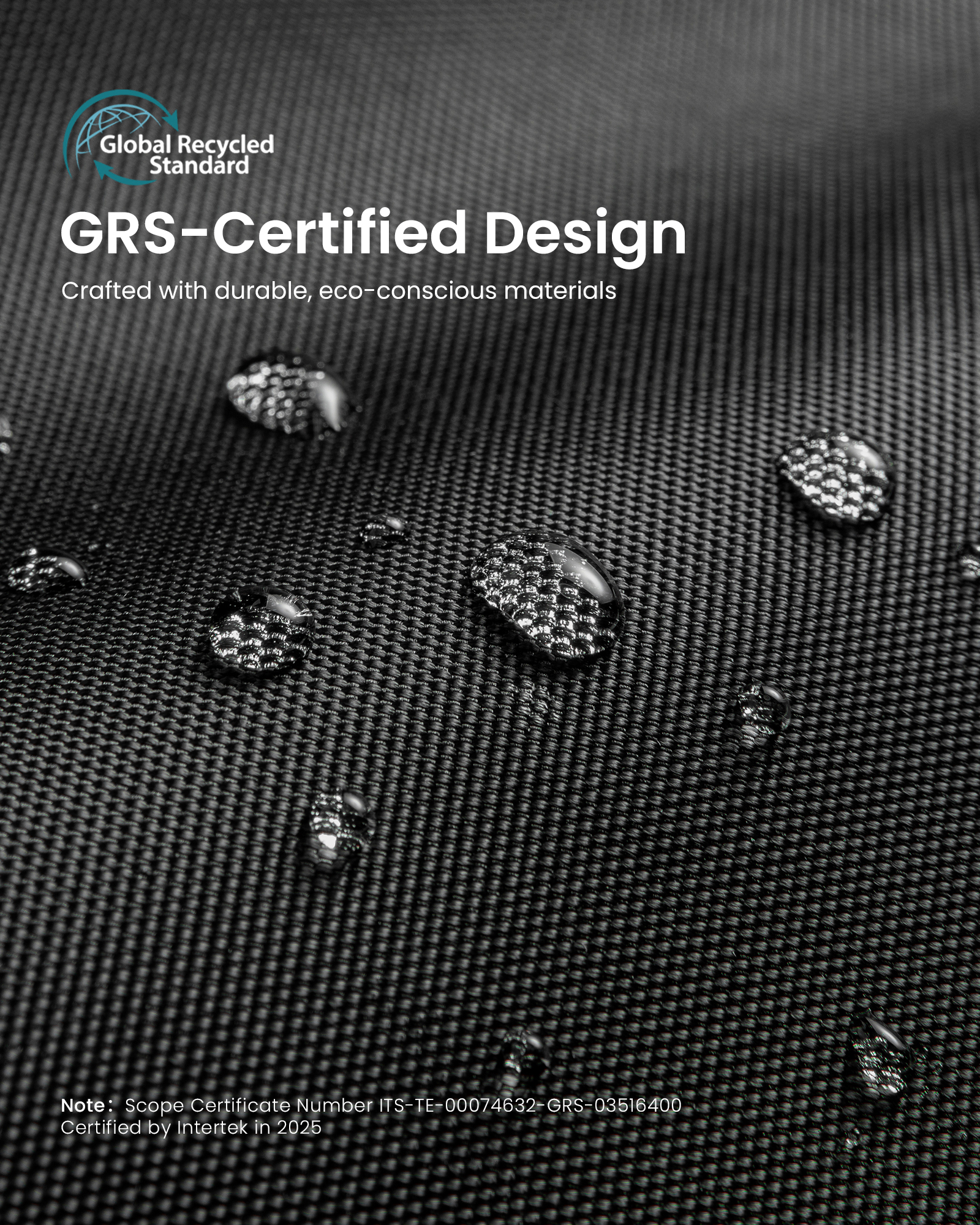 Crafted from spill-resistant, recycled fabrics with water repellent treatments without added PFAS