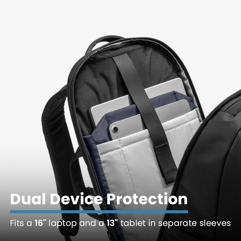 Fits a 16" laptop and a 13" tablet in separate sleeves.